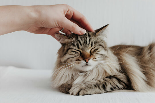 Hand strokes a relaxed cat with closed eyes, evoking calm and affectionate emotions