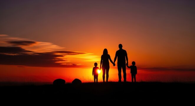Silhouette family watches the fiery sunset holding hands creating memories together at dusk