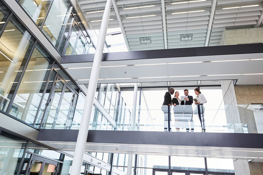 Diverse professionals engaging discussing ideas in modern office