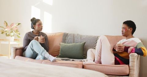 Diverse friends relaxing with coffee on cozy pink couch