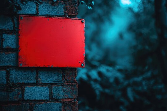 A vibrant red sign affixed to a weathered brick wall, set against a blurred teal backdrop.