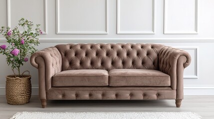 Elegant handmade artisan velvet sofa in cozy living room setting contemporary design inviting atmosphere