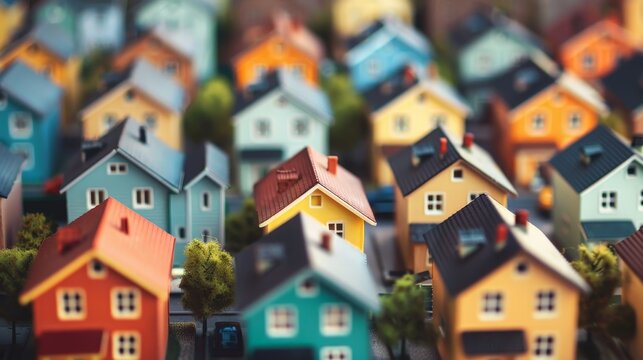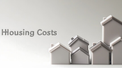 Rising housing costs are visualized with miniature house models in varying heights, set against a minimalist white background, symbolizing market trends.