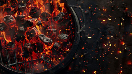 Glowing charcoal briquettes aflame on a grill, with sparks flying and intense heat creating a dramatic and fiery scene.