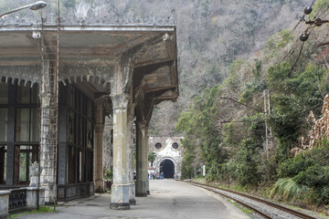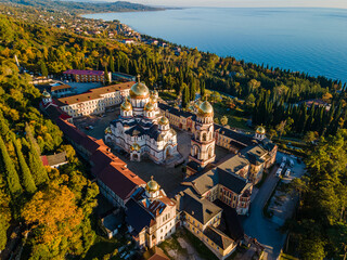 Bird's-eye view of the city of Novy Afon (Abkhazia) on a sunny summer day. The golden domes of the ancient famous monastery are visible, surrounded by slender cypresses. In the distance the Black Sea