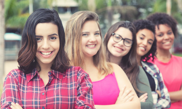 Laughing arabic young adult woman with  international girls standing in line