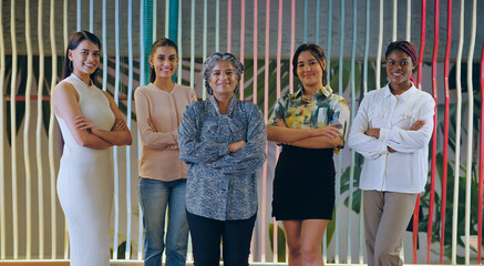 Indian happy proud senior boss ceo women lady group fold hand look camera do casual pose indoor work place. Asian smiling young adult expert girl female staff team cross arms staring cam job office
