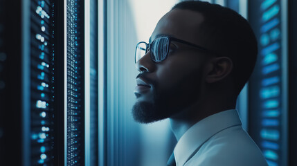 African American IT professional examining data privacy information leaks in a modern server room environment, with a focus on technology and security