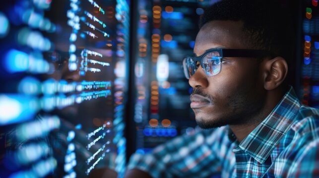 A Black African American male IT specialist is focused on analyzing data displayed on various screens in a high-tech data center, showcasing his analytical skills during evening hours