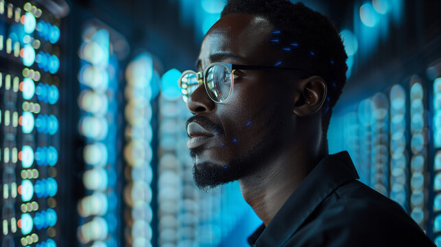 Black African American male IT specialist analyzing privacy data information leaks in a high-tech server room, surrounded by servers and blinking lights