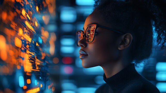 Cybersecurity analysis in a dark, tech-rich setting by an African American woman.