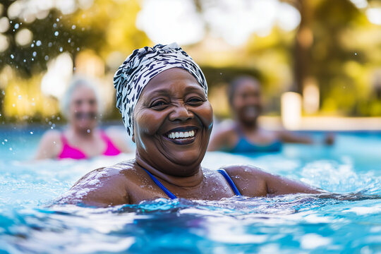 Active senior african woman enjoying aquafit class in a pool