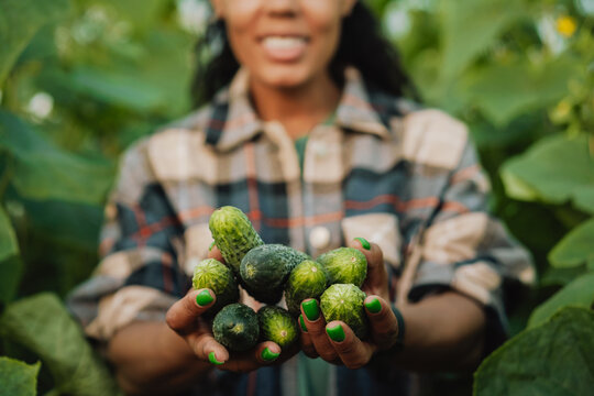 Fun portrait of beautiful black african model holding a cucumber slice to her eye, rejuvenating skin care regime treatment facial beauty concept.