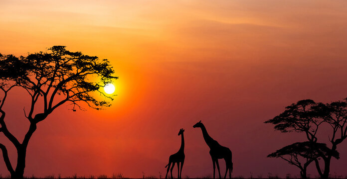 Silhouettes of african wild animals at sunset. Evening in African savanna.