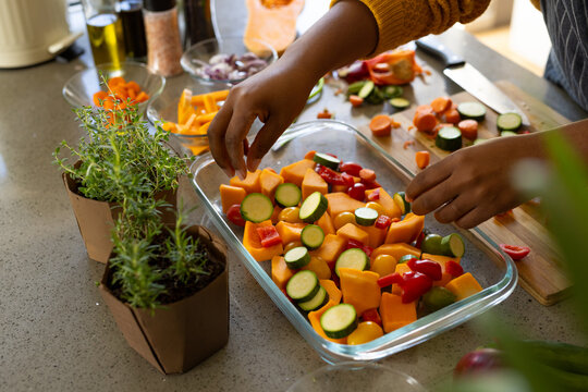 Hands of plus size african american woman in apron preparing meal in kitchen