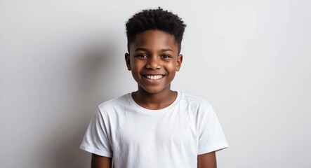 african teen boy white background wearing plain white tshirt smiling happy portrait