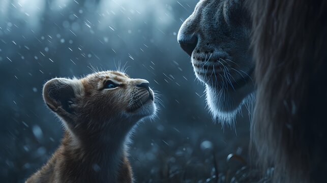 Lion father showing affection to cute lion cub closeup