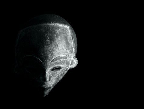 Wooden african mask on a stone wall background, Tanzania, Africa. Close up