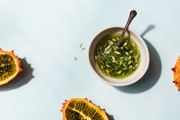 kiwano fruit or horned melon close up fresh and juicy african horned cucumber or jelly melon hedged gourd liana exotic fruits