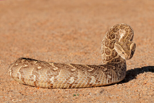 A puff adder (Bitis arietans) in defensive position, southern Africa.