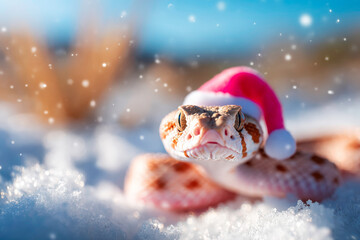 Christmas puff adder with Santa hat in snow festive venomous snake