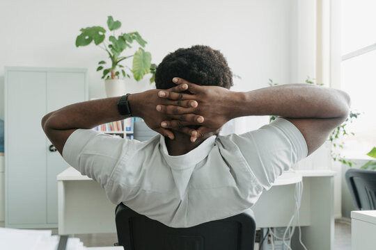 Sideways young woman of African American ethnicity wear t-shirt drink coffee read book close eyes sits in armchair stay at home flat rest relax spend free spare time in living room indoor grey wall.