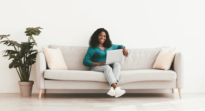 Cheerful african american millennial lady independent contractor working from home, sitting on couch next to empty white wall at cozy living room, using modern laptop, chatting with guys, copy space
