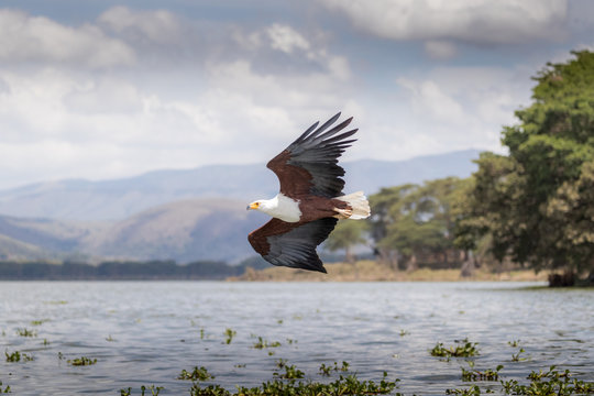 Fish eagle, Haliaeetus vocifer, about to catch a fish from the surface of Lake Naivasha, Kenya