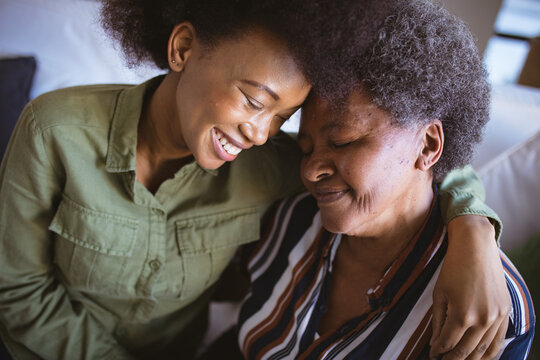 Smiling african american senior woman with adult daughter embracing with eyes closed
