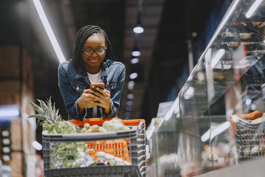 African American Woman Buying Food In Grocery Shop, Using Phone.