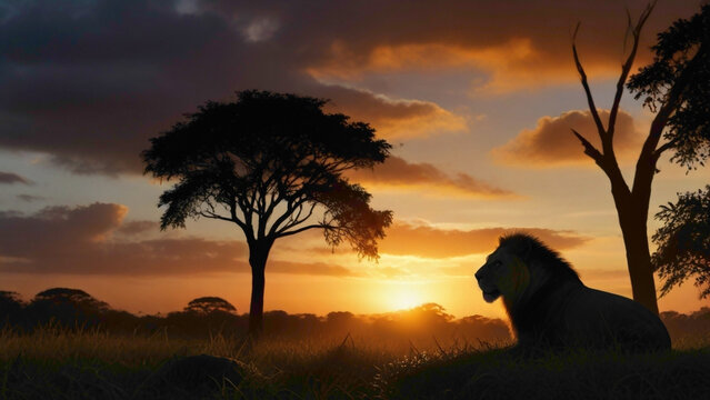 african sunset with lone acacia tree standing tall for golden grassland landscape evoking warmth solitude nature beauty horizon light shadow emotion concept.