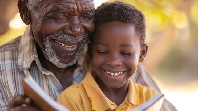 Horizontal view of a grandfather's nurturing side as he reads to his attentive grandchild.