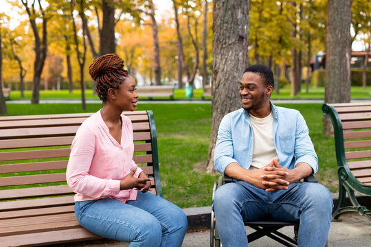 Cheerful disabled black guy in wheelchair having conversation with his girlfriend at park in autumn. Millennial Afro woman sitting on bench, communicating to her impaired male friend outside