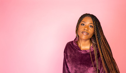 Confident african american woman standing in urban plaza wearing pink hoodie and braids