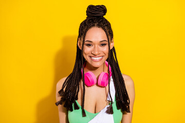 Photo of adorable sweet dark skin woman dressed white overall earphones smiling isolated yellow color background