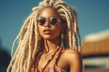 Portrait of a beautiful afro girl with blond dreadlocks outdoors on a sunny day