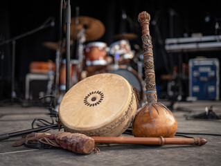 Tambourine and berimbau instruments resting on Independence stage