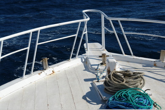 Stern of super luxury yacht berthed in marina. Teak deck on stern of sailing boat. Teak stairs ladder on motor boat. Aft part. Yachting concept.