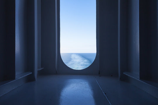 Looking down at the aft or back decks of a cruise ship and the wake or waves in the sea as it sails across the ocean. Open decks with tables and chairs and railings to view and relaz.