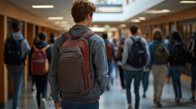 Young student stands in school corridor filled with classmates, engaged in activities while walking toward classrooms during morning hours