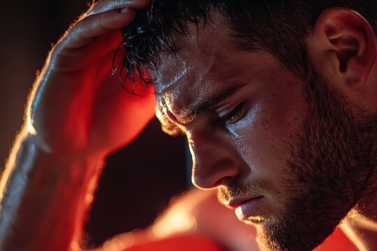 A weary athlete shows visible signs of exhaustion and emotional struggle after a game, capturing the raw reality of sports and the toll it takes on individuals.