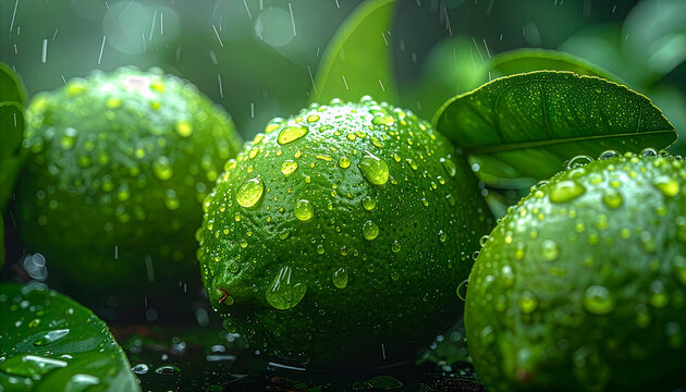 Rainy lime closeup with droplets, deep green leaves and freshness mood. Dew-covered citrus fruit, lush foliage, natural organic gardening concept. Fresh limes after rain, glossy skin texture
