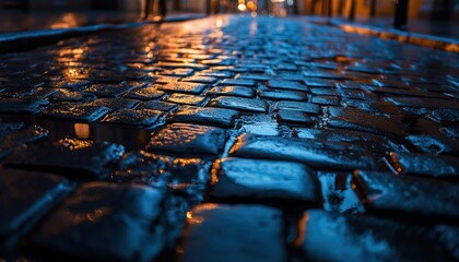 Bottom View Of Wet Cobblestones On A Street Or Road Surface At Night Following Rainfall. Stunning And Reflective Scene. Beauty In Simplicity.