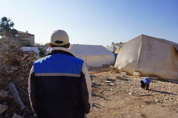 The back view of the rescue team in jackets standing looking at the condition of the refugee camp where many earthquake survivors have taken refuge in tents for fear of aftershocks.