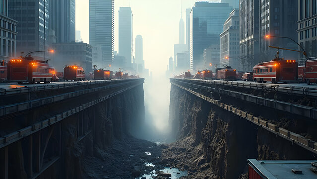 A row of cars stranded in deep fissures on a cracked urban road after an earthquake