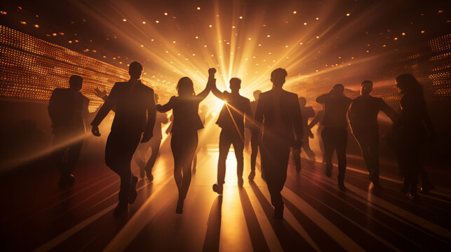 Silhouette of a group of joyous excited men dancing in luxury trendy club for an afterwork party with golden light
