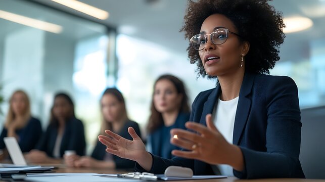 Businesswoman leading a team discussion, with everyone seated around a table and focused on the topic at hand
