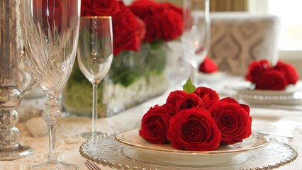 Elegant table setting features crystal glasses, floral centerpiece, delicate china, and lace tablecloth, creating a romantic atmosphere for a special occasion celebration.