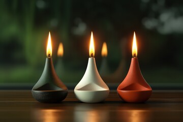 agal vilakku with a slight shape teardrop with blunt edges of Separate three vilakku lit with cotton wick on the blunt edge with the flame starting from the tip of the agal vilakku