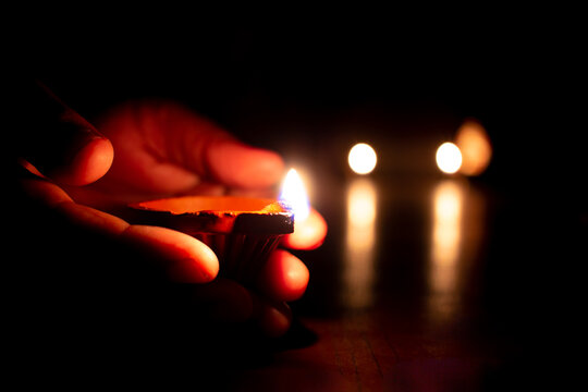 Person holding diya with hands during the Indian festivals. Karthigai deepam (festival of lights) celebrated in south india.